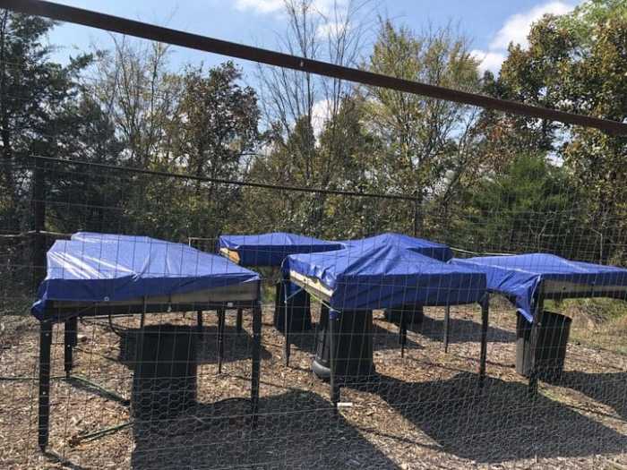 My experiment with tarps wasn’t as good as this, either, because the tarps didn’t stand up well with the temperature differences, the wind, the snow and ice, etc. I had put buckets in the center of each box to try to keep water from pooling, but that had varying success. The tarps also tore and the bungee cords I used didn’t hold the tarps on as well as I had hoped.