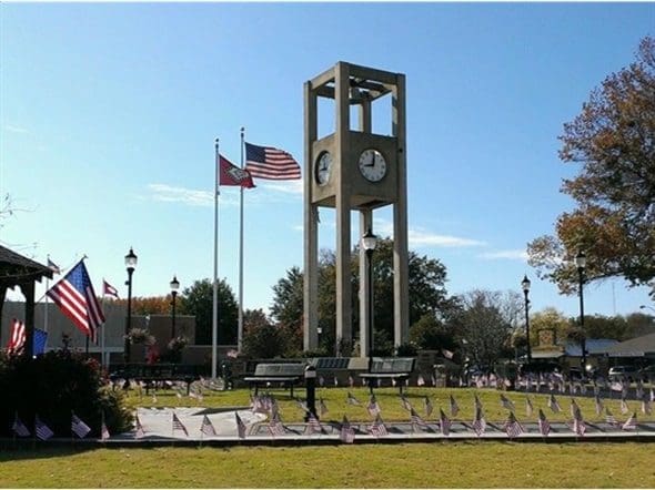 Today we honor the men and women in uniform who have defended our country from those who would cause us harm. It’s a national day, but ultimately is very personal for each city and town. In Greenwood, Arkansas, where I live, the center of our small square is the Veteran’s Memorial. This is an old photo, but it gives you an idea of how the memorial looks today. There is a small bronze statue representing each service that are on the ground at the base of the clock. People have honored the veterans in their family, buying a small plaque which is engraved with the veteran’s name, rank, branch of service and dates. Newer plaques are added to the others from time to time. The park kind of resembles the spokes on an old wagon wheel now and each plaque has an American flag on days like today. There are sidewalks so that you can walk through reading the names, or sit on a bench.