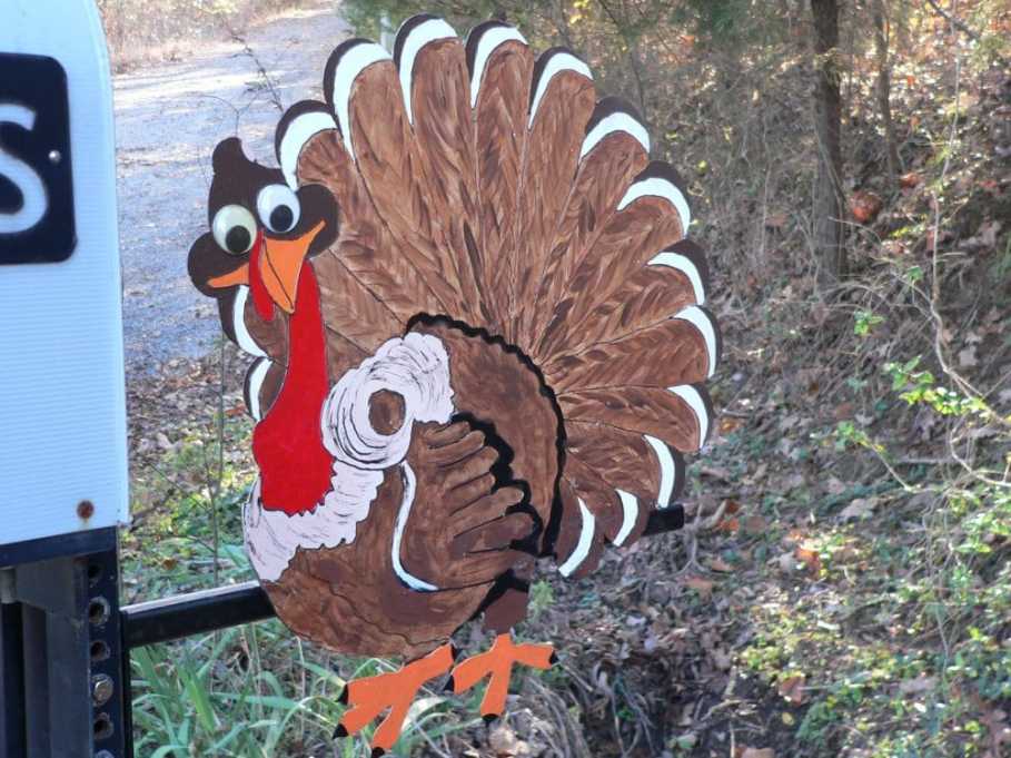We got the turkey put up on the mailbox, but I forgot to take my camera. Since we made this decoration, I added Googly Eyes, so the expression on the turkey is a bit different.