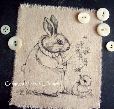 Michelle Palmer does fine art ink illustrations on tea-stained cotton.