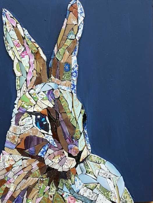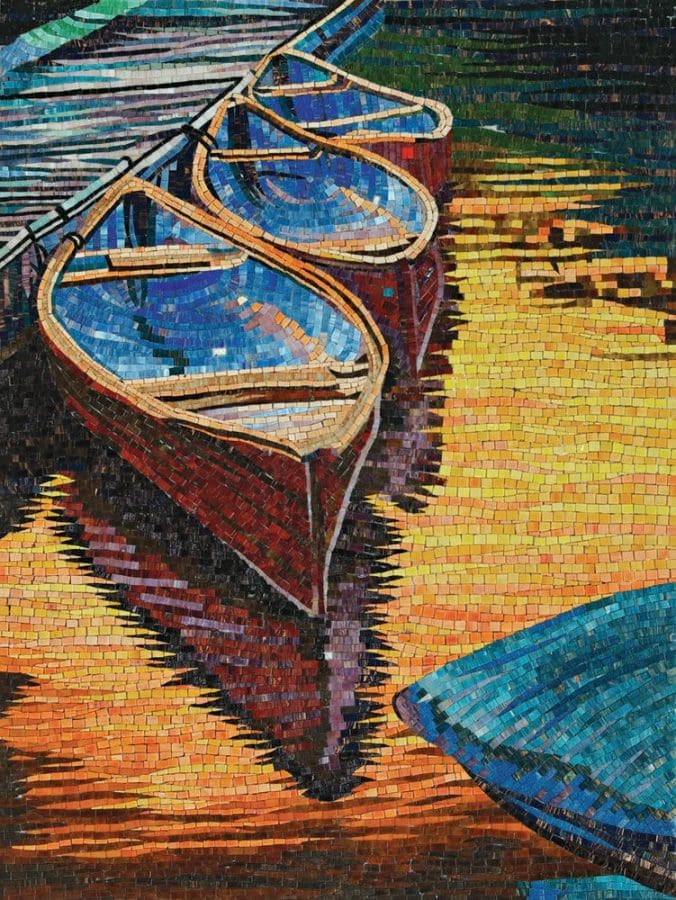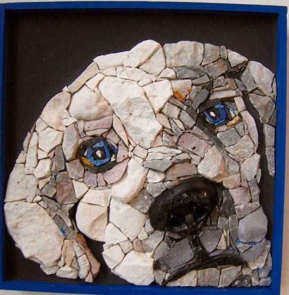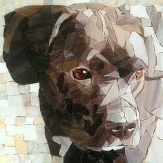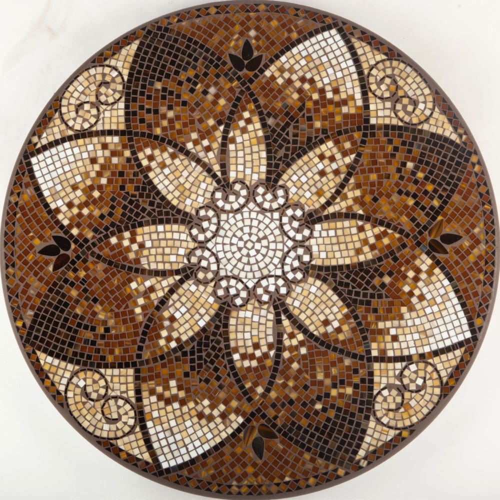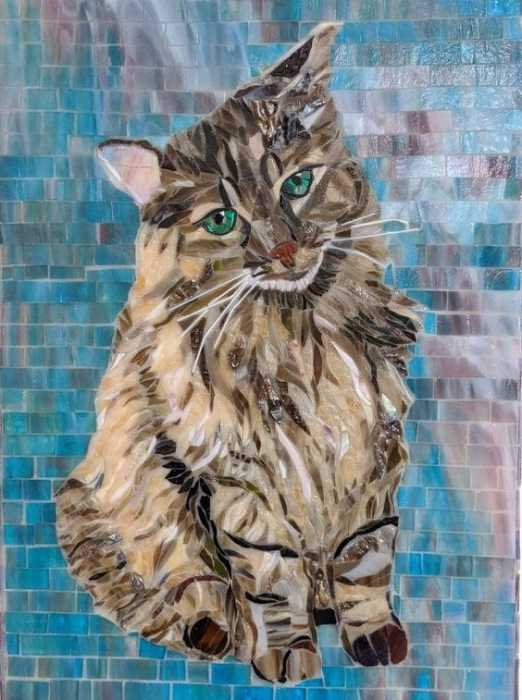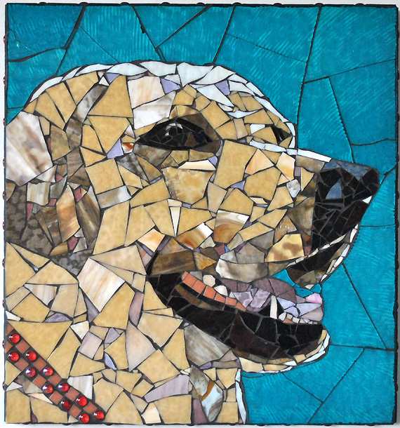 All of the pieces of tile are now glued onto the glass. (This is the bowl upside-down. I’m planning to spread grout on the bottom so I can ‘sign’ it, using a baby trowel type tool.)