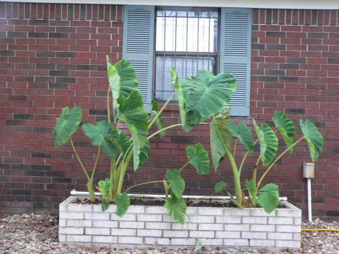 My elephant ears are happy and thriving, even though I do need to clean them up a bit. These will be devastated by a truly hard freeze.