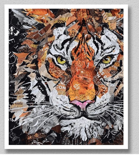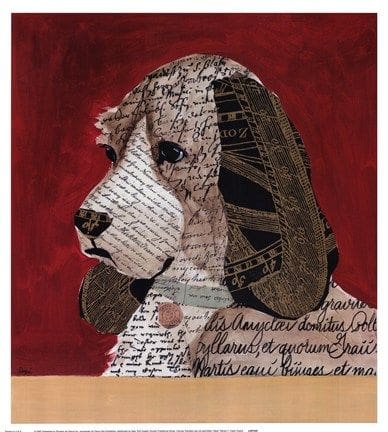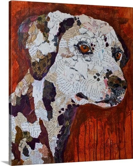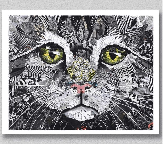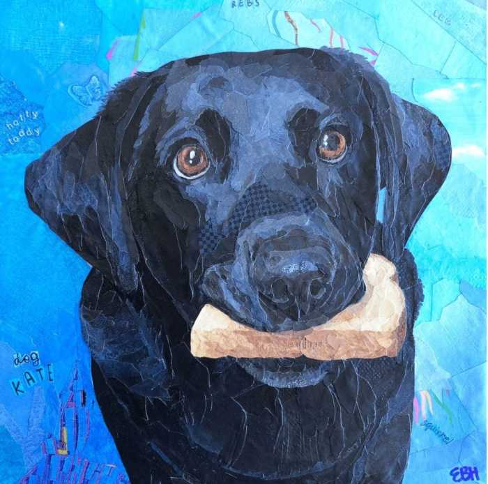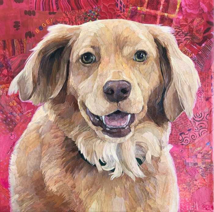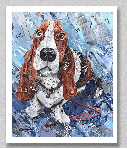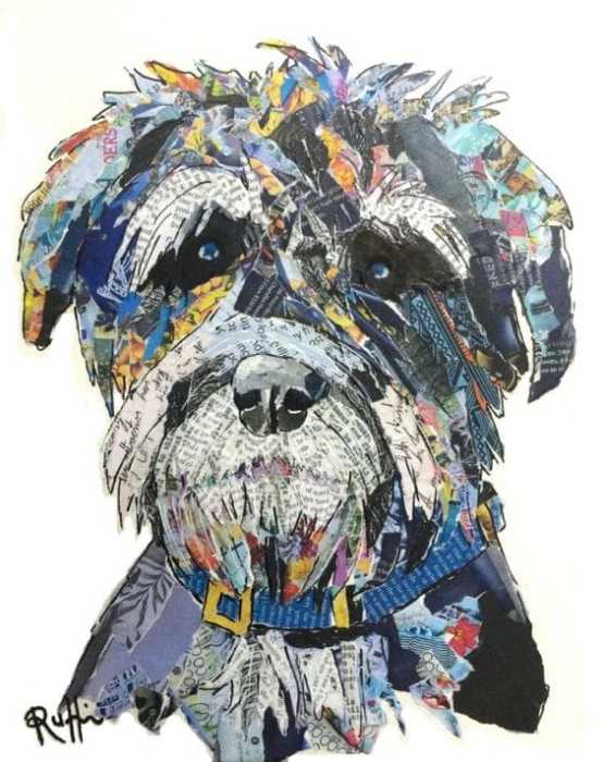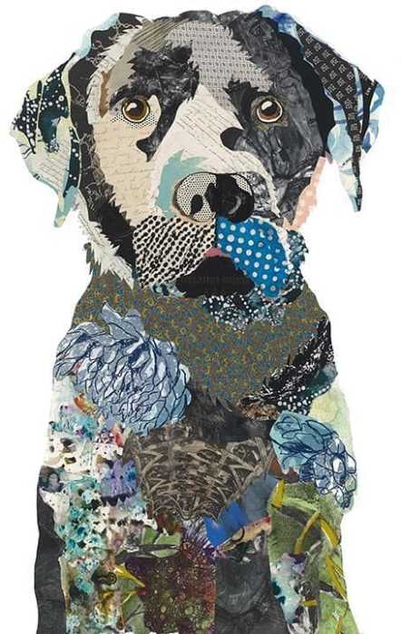 Emmie creates pet portraits via paper collage. She starts out with a picture you have sent her. She sketches the pet, then gathers bits of magazines. She creates the background first, then creates the pet’s body, finishing up with eyes and nose, capturing the personality of your pet. She includes words in the background of the portrait that mean something particularly to you, such a a pet’s nickname, other pet’s names, the pet’s favorite toy, etc. Also, somewhere in each portrait is a hidden butterfly.