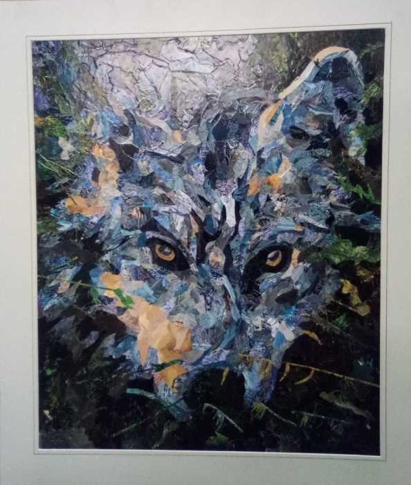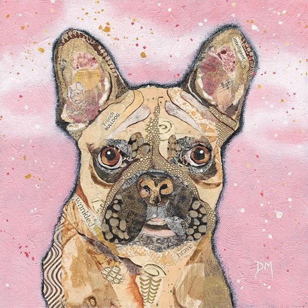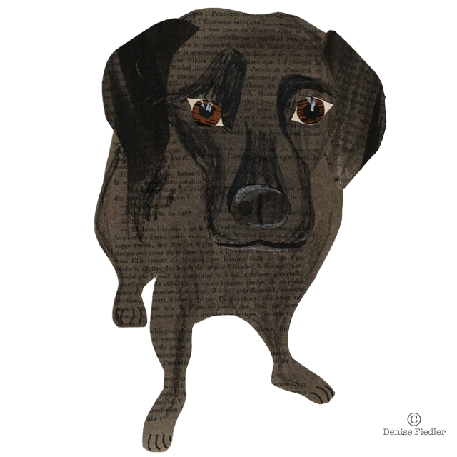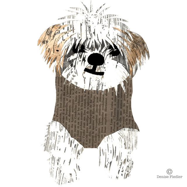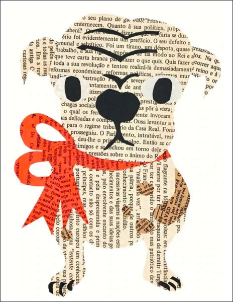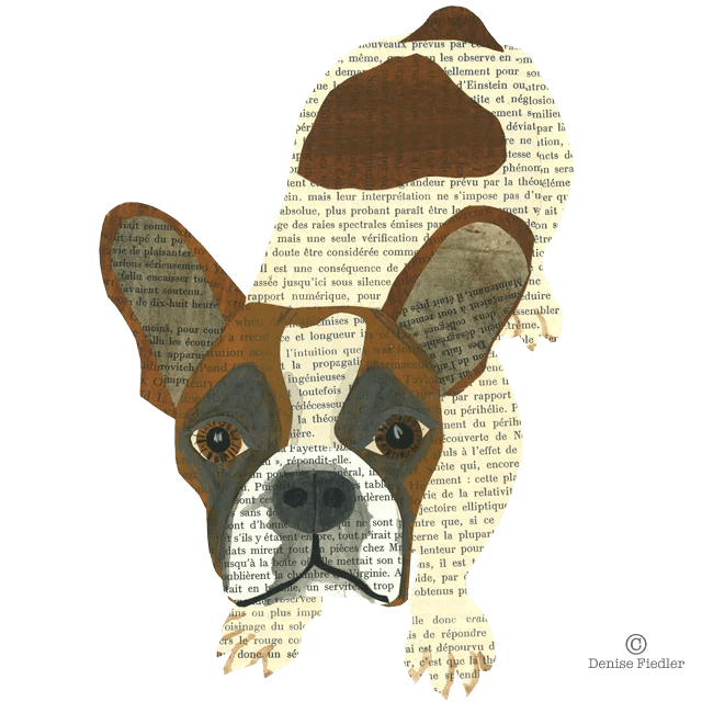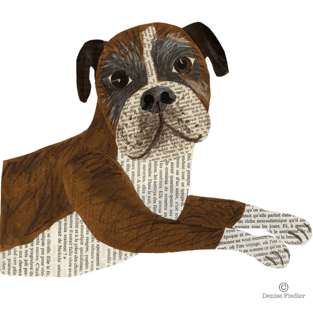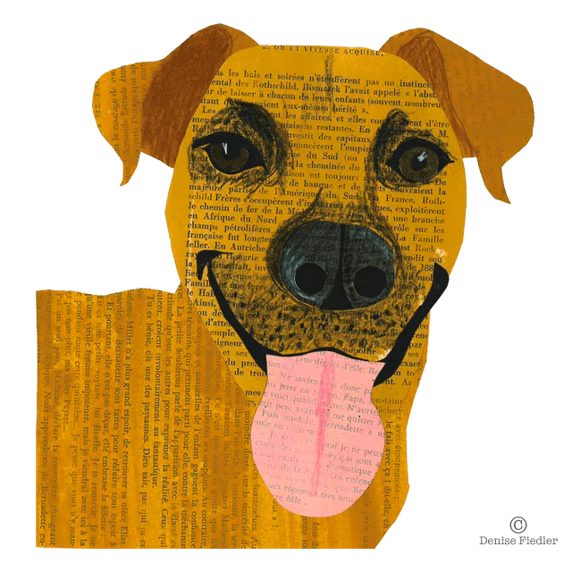 Emmie creates pet portraits via paper collage. She starts out with a picture you have sent her. She sketches the pet, then gathers bits of magazines. She creates the background first, then creates the pet’s body, finishing up with eyes and nose, capturing the personality of your pet. She includes words in the background of the portrait that mean something particularly to you, such a a pet’s nickname, other pet’s names, the pet’s favorite toy, etc. Also, somewhere in each portrait is a hidden butterfly.