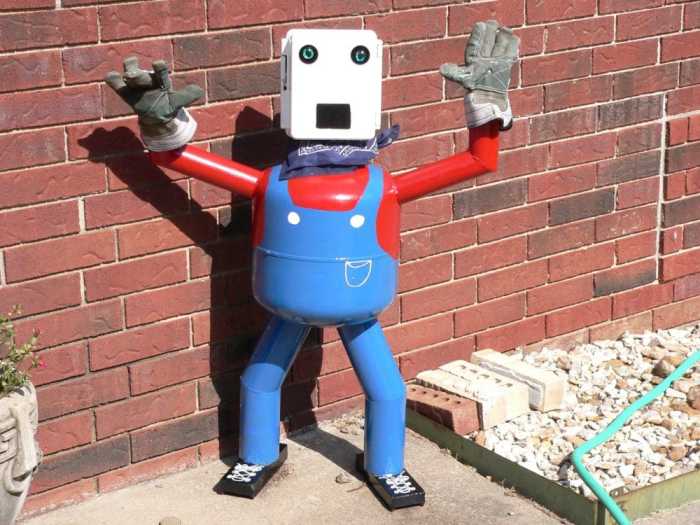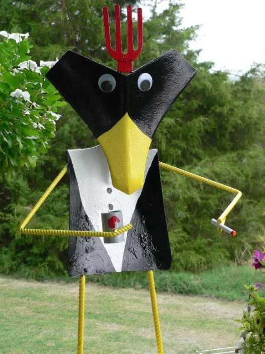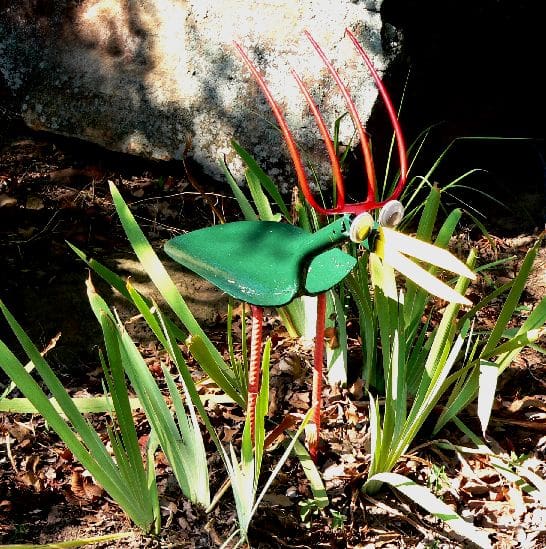 My husband and I love to look at scraps and put them together to make a ‘critter’ to live in our yard. We use old tools, machine parts, scraps of any kind. We attach the pieces or weld them together, then paint them with outdoor paint and figure out where they will ‘live’ in the yard.