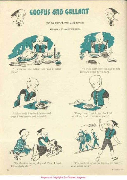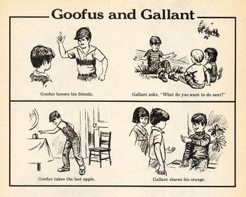 “Goofus and Gallant is an American children’s comic strip appearing monthly in Highlights for Children. The comic contrasts the actions of the eponymous characters, presenting Gallant’s actions as right and good and Goofus’s as wrong and bad.” ~ Wikipedia