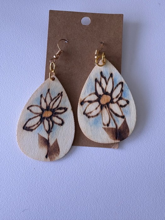 Then she pointed to my ears. Then she pointed to HER ears, showing me she had holes for pierced earrings. I’m not at all sure what she was trying to tell me, but when I got back to my place, I got out a pair of wooden earrings that I had wood-burned a flower on, and I now have them in my carrier for the next time I see her.