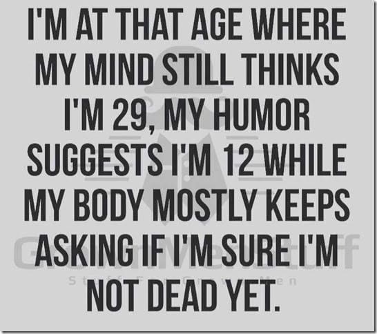 Unless I overdo, with my back or hips reminding me that SOME people might describe one of my years as “elderly,” I feel about 40. Old enough to know better about a lot of things, but young enough to thoroughly enjoy life. And I think feeling that way is pretty darned good.