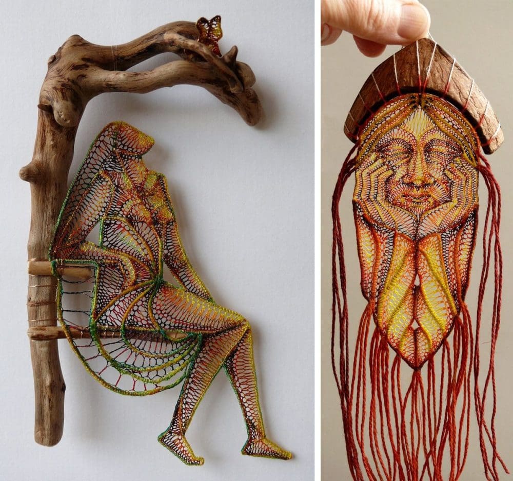 Figural Lace Sculptures Attached to Found Wood by Agnes Herczeg