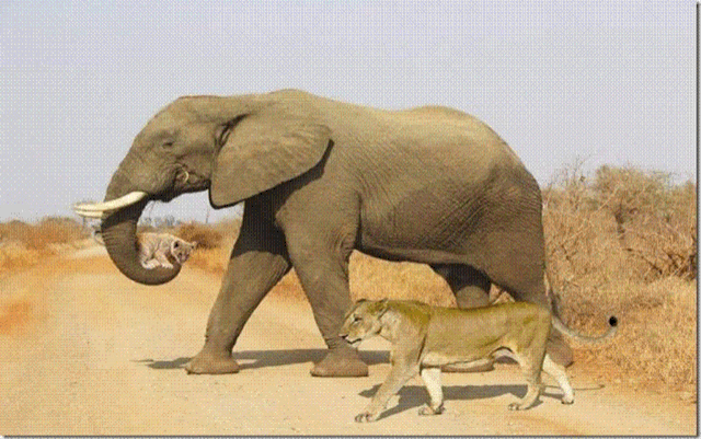 It was considered the best photo of this century. A lioness and her cub were crossing the Savannah but the heat was excessive and the cub was in great difficulty walking.An elephant realized that the cub would die and carried him in his trunk to a pool of water walking beside his mother.