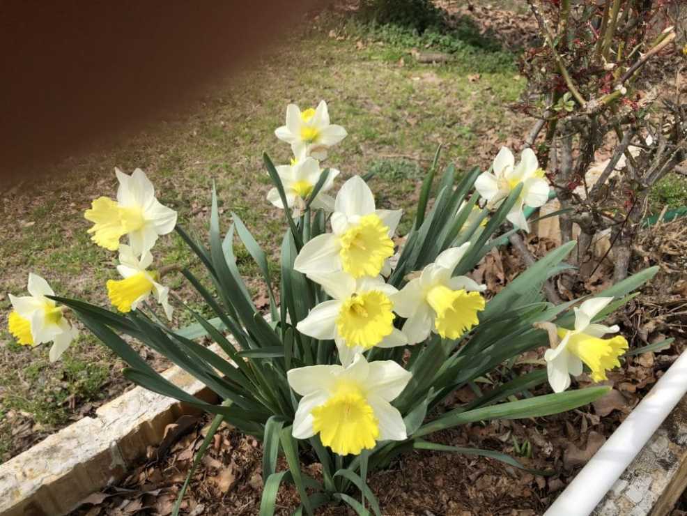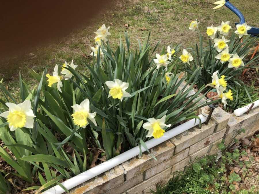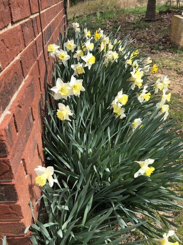 This afternoon, my husband walked with me while I took Amber out to the garden and around the yard, training her to walk with the no-pull leash/collar combination, and even HE was remarking how lush our daffodils look right now!