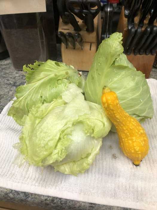 Today I have harvested these two cabbages, a head of lettuce that was trying to spoil, and the yellow crookneck squash here. I have lettuce leaves in the sink awaiting processing.