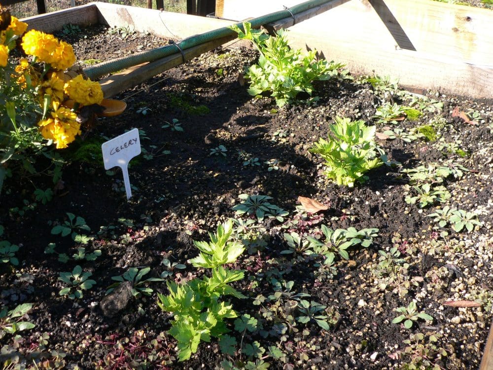 The marigolds are happy. They don’t have very many plants to protect right now. Such happy-looking flowers! (Celery plants are along the back of the marigolds.)