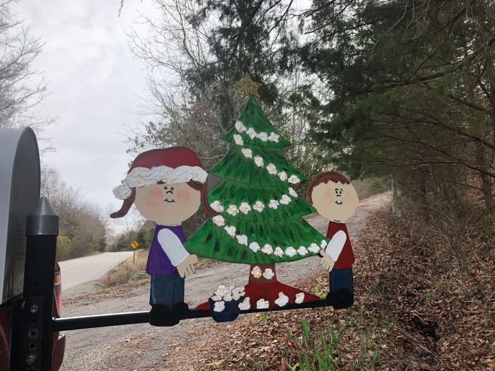 Here is one of the mailbox decorations my husband and I made for the Christmas season. I miss getting to change the decorations each month, celebrating holidays, honoring favorite cartoon characters, etc.