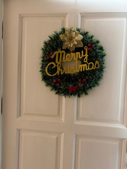 I am LOVING the fact that my door works well now, and I can go out and come back in all by myself! It acts like a real door! Added to that, we ordered and put up a Christmas wreath a couple of days ago. I smile every time I go out or come back in. 🎄