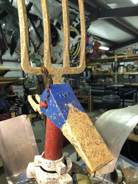 This one is a “Cleaning Robot.” He has a broom in one hand and a ‘dust pan’ in the other, ready to do a quick clean-up when needed. His bow tie used to be bright red. Since his has really faded and is also rotting, a new one is on the way. He is made from a combination of an old propane tank and scrap metal, plus an old set of fireplace tools.
