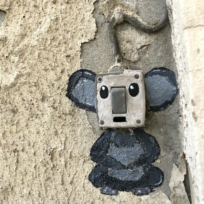 I love the art created by David Zinn, but I’m even more delighted by his vision. When most people look at the place where the wall meets a sidewalk, they see the weed growing. The fastidious among us might bend over and pull the weed, or think that the weed should be sprayed with weed killer.