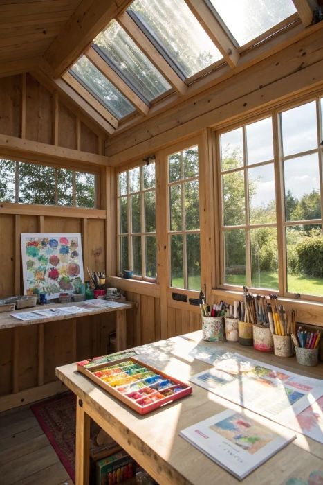 Another good design with the large table, especially for projects that require many stages. I like the windows in here, too.