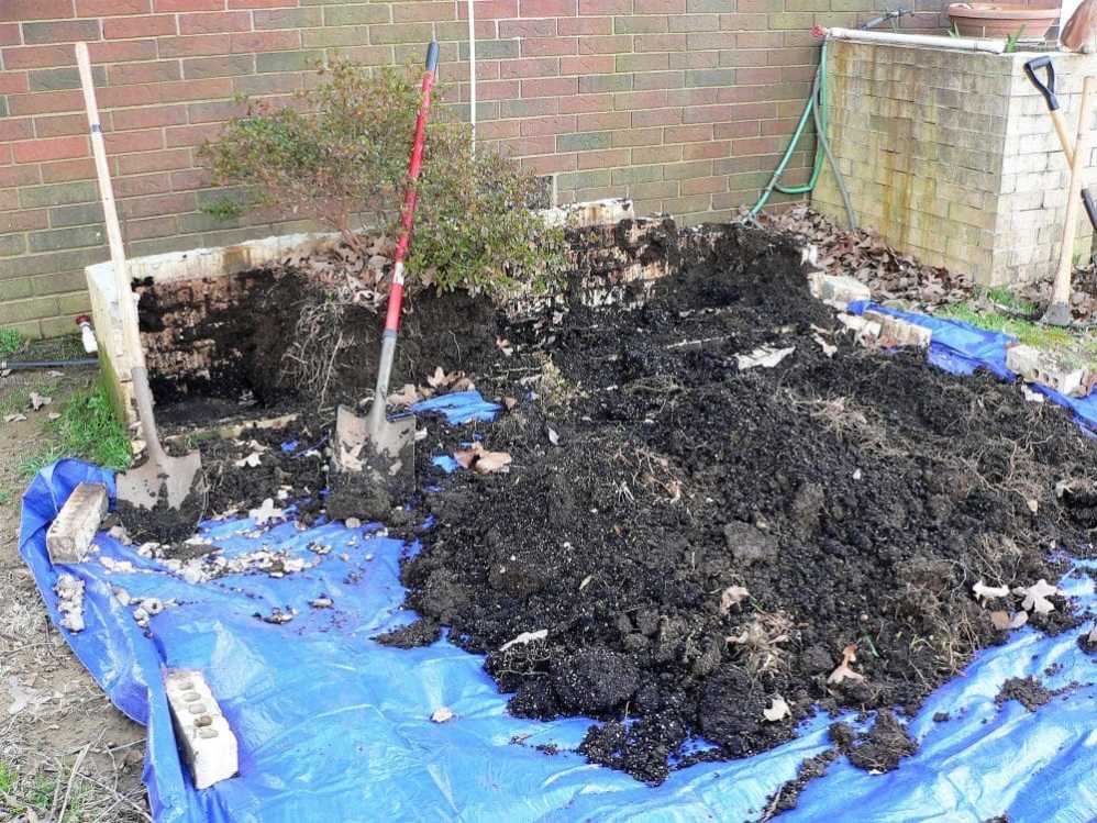 You can see where we are now. We just finished our errands for the day and are resting a bit before we tackle this again. Since there is a good chance for rain tomorrow, we really need to see if we can get the dismantling done today, including digging out the remaining plants, digging out the rest of the potting soil, knocking down and hauling off the rest of the bricks, and then wrapping the tarp around the soil and putting bricks on top to try to save as much of the soil as possible for the rebuild in the spring.