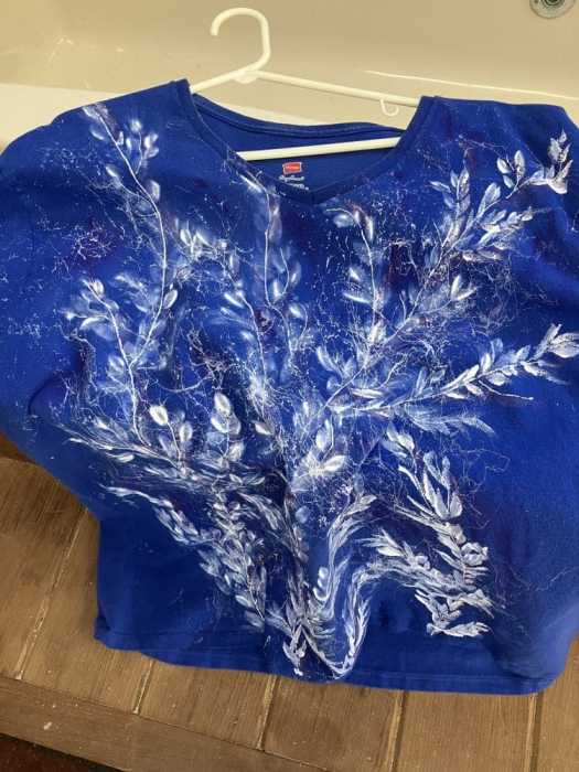 So my solution is to paint the tee to cover the stain so I can continue enjoying the tee. About half of my plain tees are now ‘painted’ with one design or another. I’m wearing one now that has a cotton-ball flower type design all over the front.