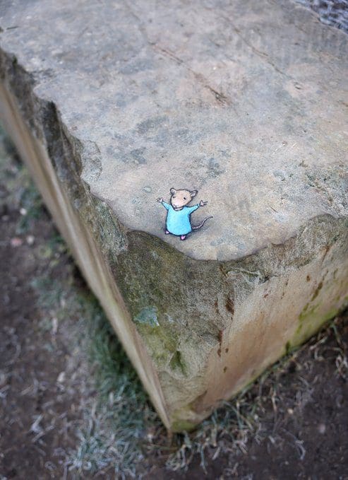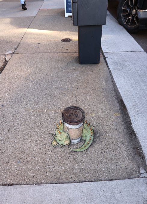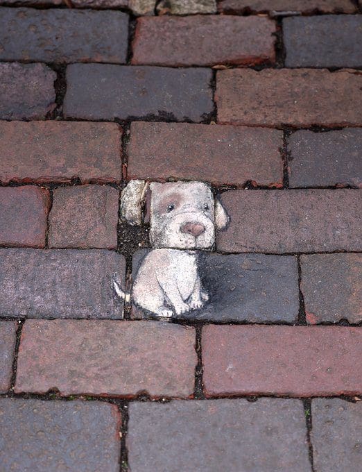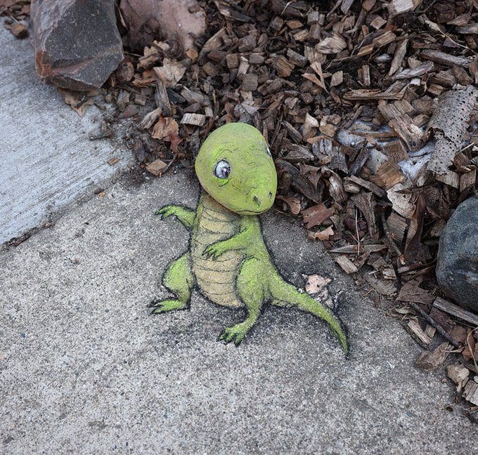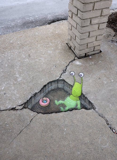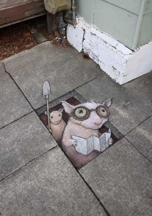 “David Zinn was a freelance commercial illustrator for more than twenty years until he picked out some sidewalk chalk to “work” outdoors on a beautiful day. Since then his work has appeared on streets around the United States and as far away as Taiwan, Sweden, Germany, France and Holland. He is the author of Temporary Preserves and Underfoot Menagerie and has been featured in The Guardian, Business Insider, and the Los Angeles Times, among others. Zinn lives in Ann Arbor, Michigan.” ~ Google.com