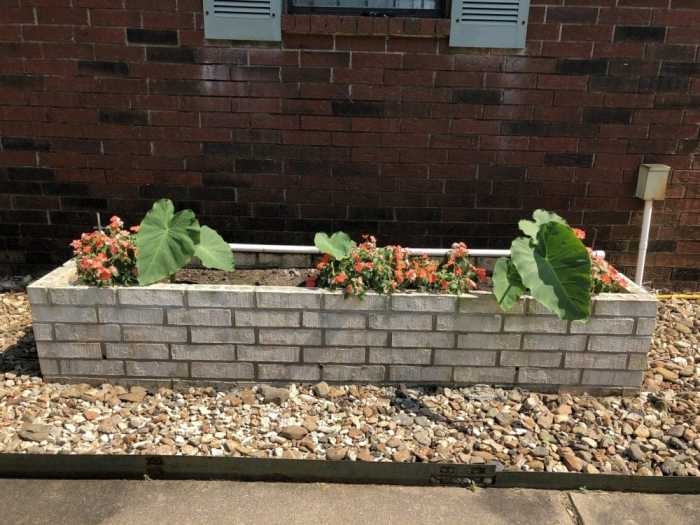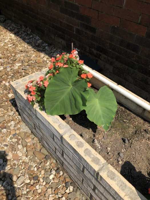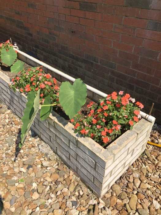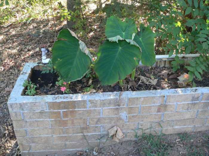 This is the planter in front of the garage. The elephant ear plant is doing really well so far.