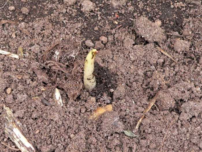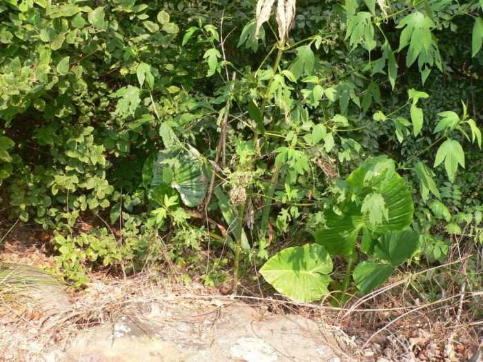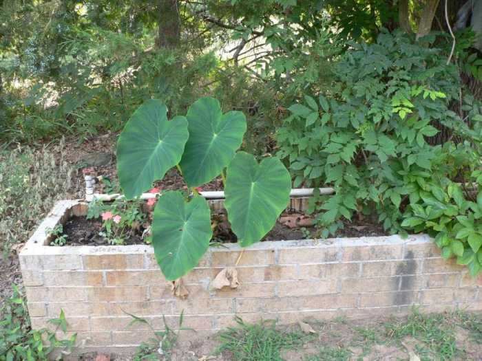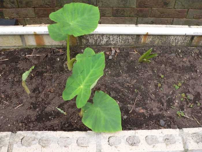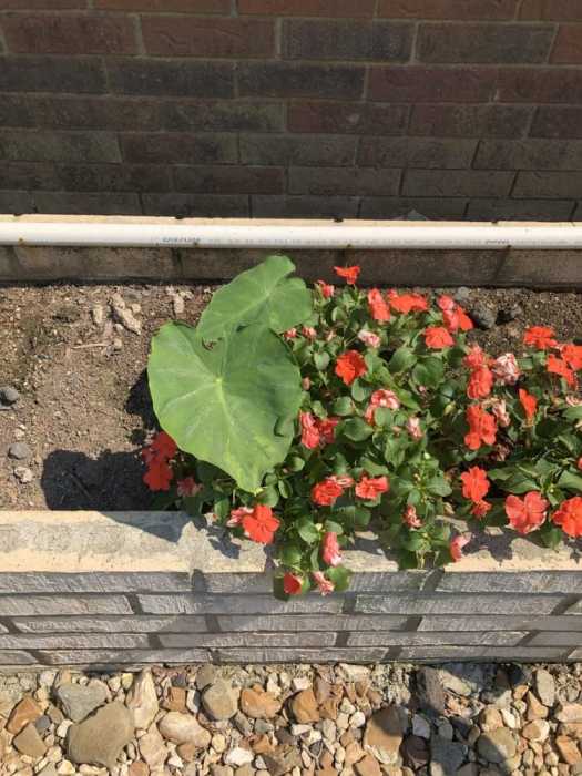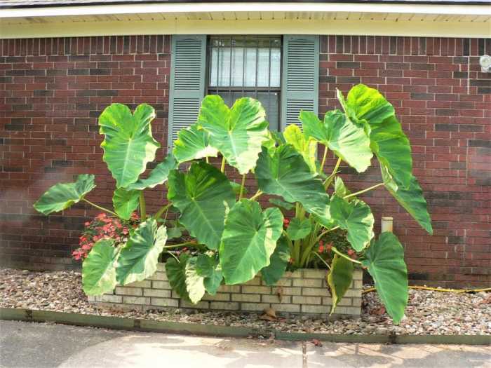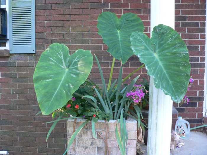 I’m a bit worried about this one. This planter is on the east end of the house. It’s shaded, but we’ve had elephant ear plants here before and they did well. This one is really growing slowly.