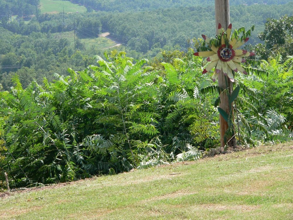My husband got out our push weed whacker that looks much like a small lawn mower, saying it would make quick work of the remaining stuff. We couldn’t get it started, though. We decided that there was condensation in the gas and had to work with it for a LONG time to finally get it running. I used it and was able to do quite a bit more, but the land slopes pretty violently down across the yard and I didn’t want to end up on my head half way down the hill with various parts cut off. We also had stuff sticking up here and there that was too much for even the push around whacker.