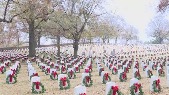There is a special time for people who have loved ones in the cemetery to put a wreath on those headstones in a more private setting. When that has been done, volunteers put a wreath on all the others until all are decorated. As you can see, the finished product of the efforts is impressive.