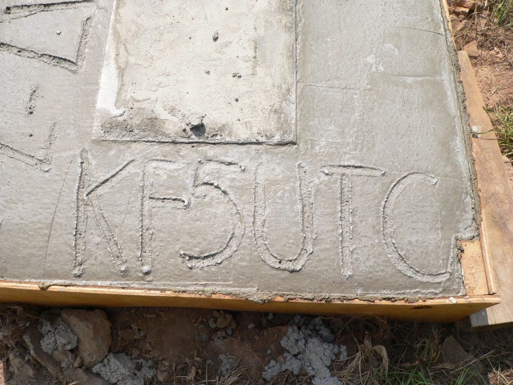 The concrete mixer would handle up to 3 sacks at a time. Most of the time we kept it to 2 sacks. But the mixer did a wonderful job. They also brought a vibrator, which was an electric vibrating pole-looking attachment that got the bubbles out, made sure the mix was good, and really did miracle work for us. There was very little hoeing to be done – mainly to move the poured concrete to the opposite side of the form when necessary. Dave finished the top off with a regular concrete smoothing tool, encasing the metal attachment base in its proper place in the middle of the concrete.