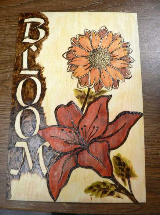 “Bloom” is what I finished yesterday and it’s listed on Etsy now. I did the wood-burning, then used alcohol ink and finally pastels to finish.