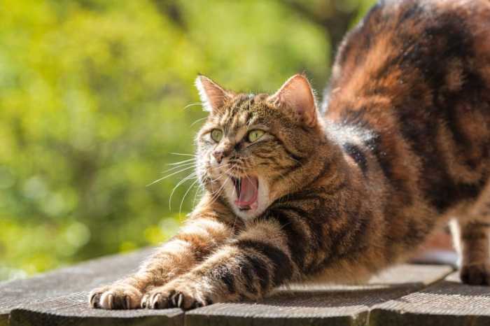 I did my yoga stretching for the 2nd day. I didn’t do much better, but I’m determined to do the best I can. Yesterday both Amber (97 lb. yellow lab) and Abby, (? lb. stripy cat much like the one above) tried to HELP me with my practice, either by outright stomping on me or trying to nuzzle me. I think my laughter relaxed me almost as much as the stretches. :0)