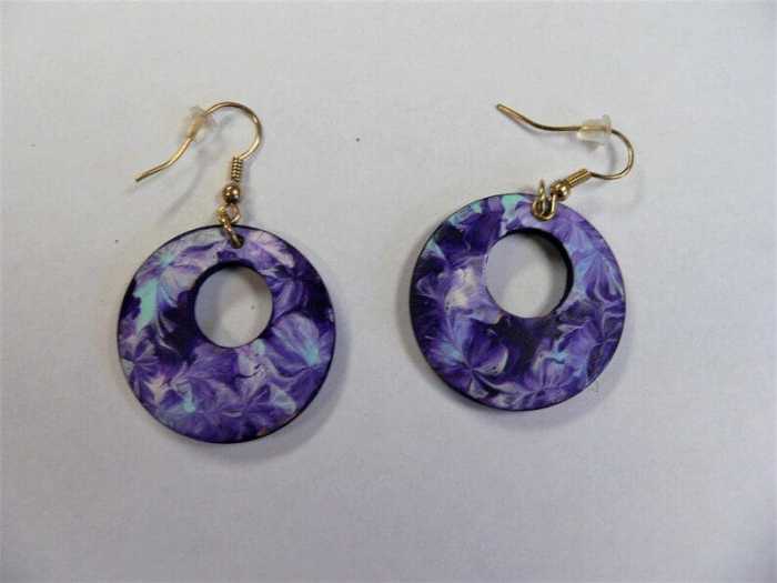 1.25″ Purple, Turquoise and White hand-painted, one-of-a-kind 3D rounded disk earrings. French hooks and marshmallow cushion backs. Swingy, flirty, and fun, you’ll love wearing these. They are comfortable and light weight. $10.00.