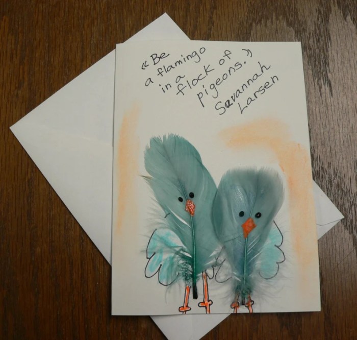 One of a kind handmade greeting/note card using real feathers. “Be a flamingo in a flock of pigeons.” Savannah Larsen. Blank inside. 5″ x 7″. “Birds of a Feather” Series by Linda Lewis. $3.50 with Free Shipping. Browse through unique cards and packages on HandmadeHavenbyLinda on Etsy using this LINK.