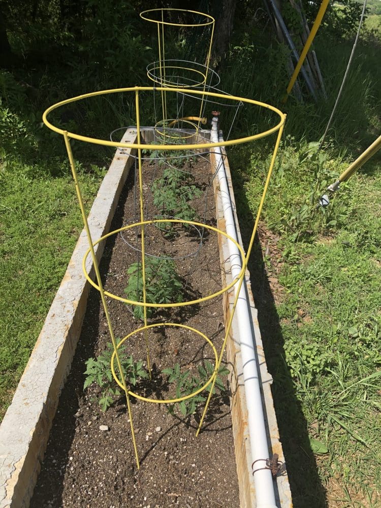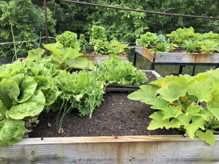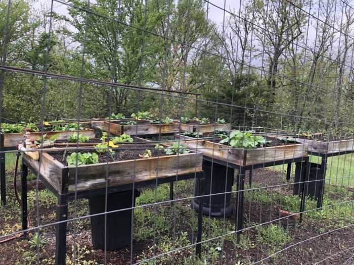 “Raised bed” – because we built six 4’x4′ wooden boxes, put them on top of metal supports (like tables) at about my chest height, so I don’t have to get down on my hands and knees, or bend over double to garden.