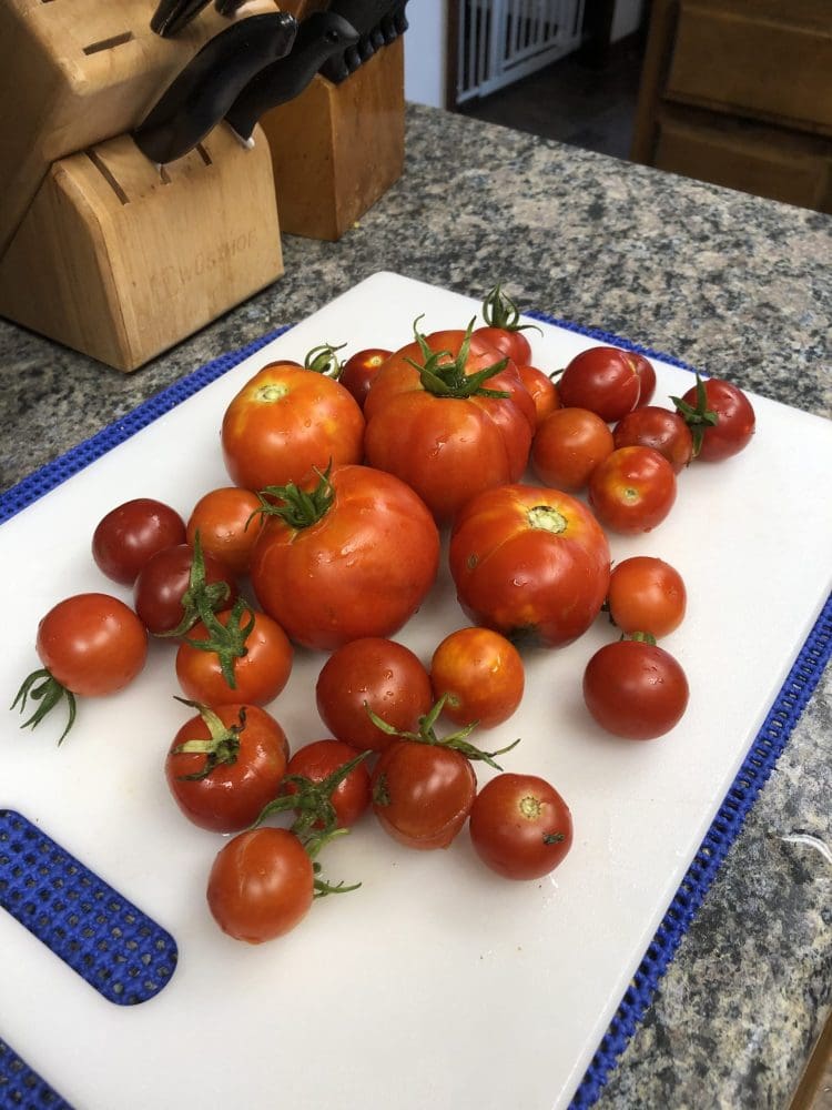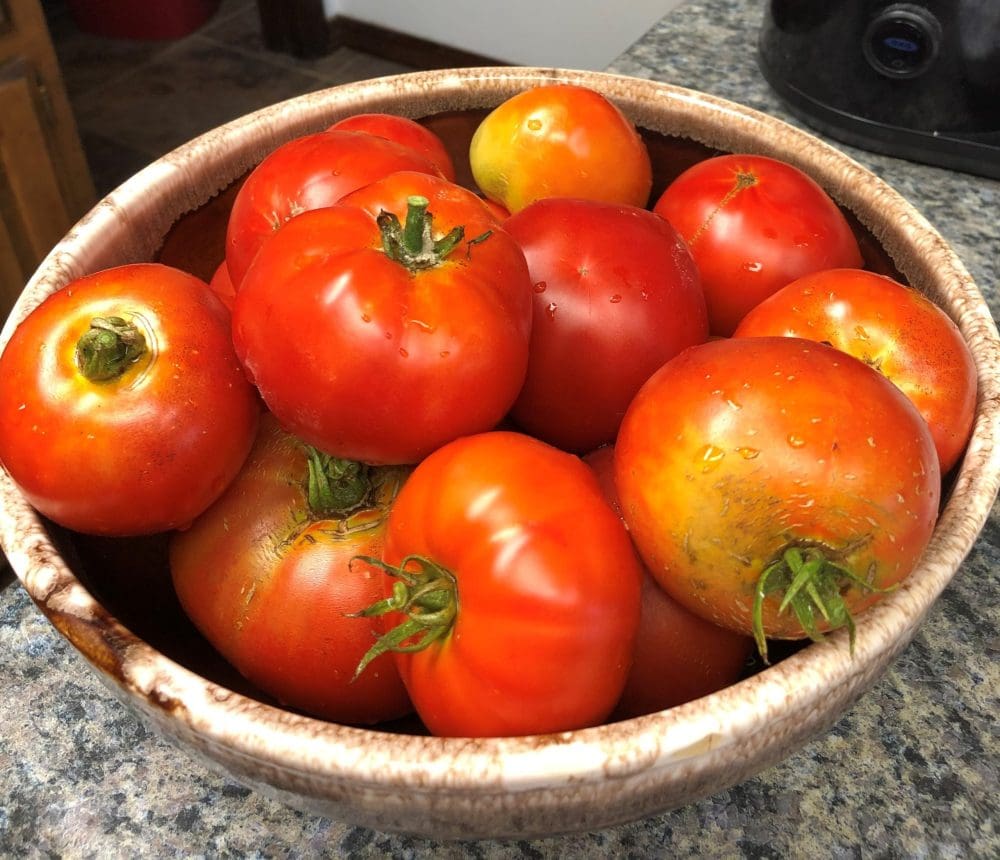 Here is today’s harvest. I was so pleased to see more ripe tomatoes. And these, except for one, all came from the plants in the long planter that had yellow leaves and were looking spindly recently. I added bone meal and some tomato food, and they have responded well, although they don’t look as healthy as the two plants in the planter beside the house. MAYBE it’s a good thing to have much less greenery – leading to better production of tomatoes….