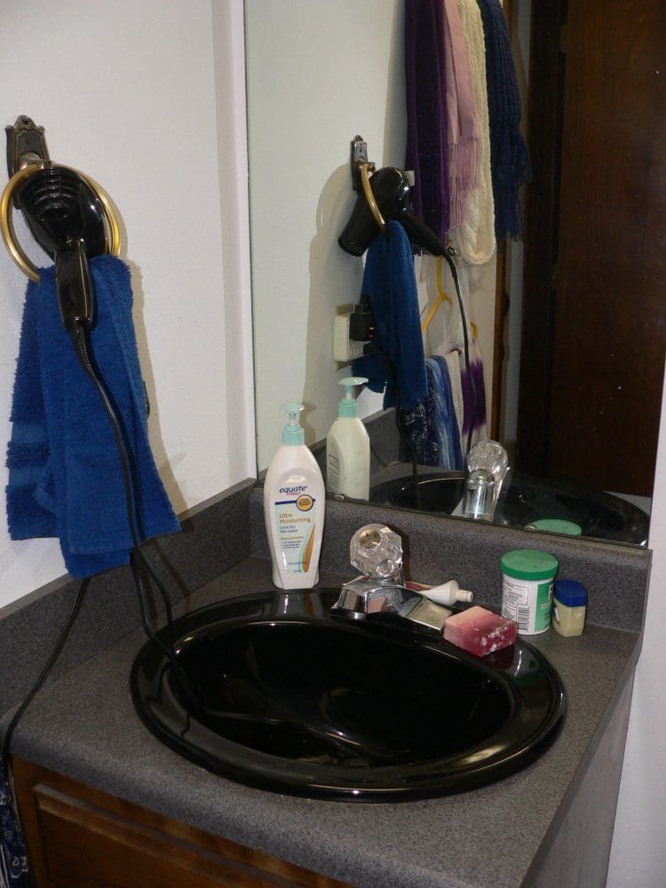 - Today I tackled our “back” bathroom. This one is off our utility room. I use it daily after breakfast to dry my hair, put on makeup, etc. The cats also have their litter box there – in case a need arises and they happen to be inside and no one is reacting to their pleas to go out.