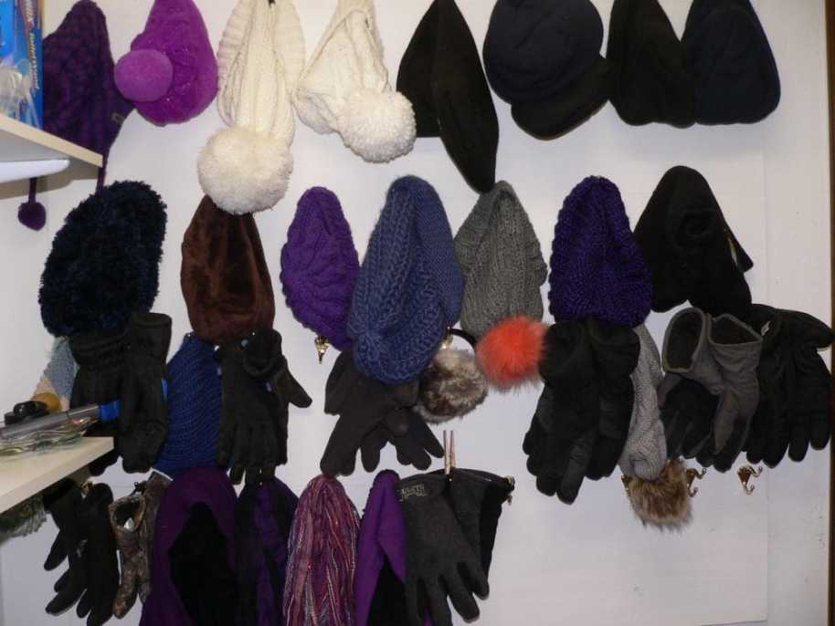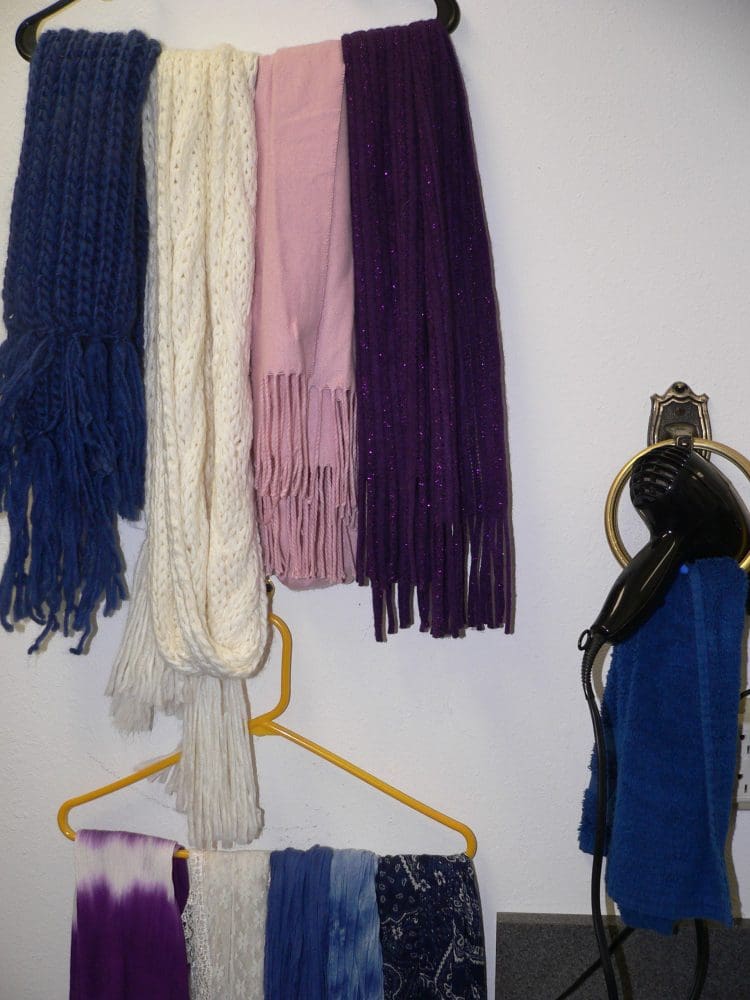 Since this bathroom is right next to the door to the garage, my husband and I put up 2×4’s flat on one wall, then painted them white to match the wall, then put up a gazillion or so hooks to hold our hats, gloves, etc. years ago. Later, we added a couple of short shelves, since the cabinet under the sink is small and we needed more storage space.