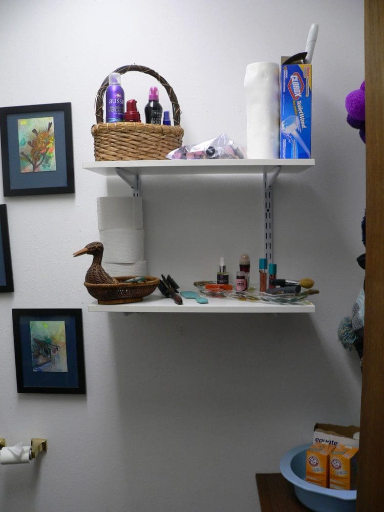 Since then, the shelves had become a catch-all for cleaning supplies, paper supplies, make up, an electric razor plus attachments for cutting hair, and more. All were studiously ignored, so there was a layer of dust on the top shelf, and there was so much on my make-up and toilet paper shelf that the things threatened to tumble off onto the floor if I wasn’t really careful when I picked something up. Cleaning the actual shelf was impossible.