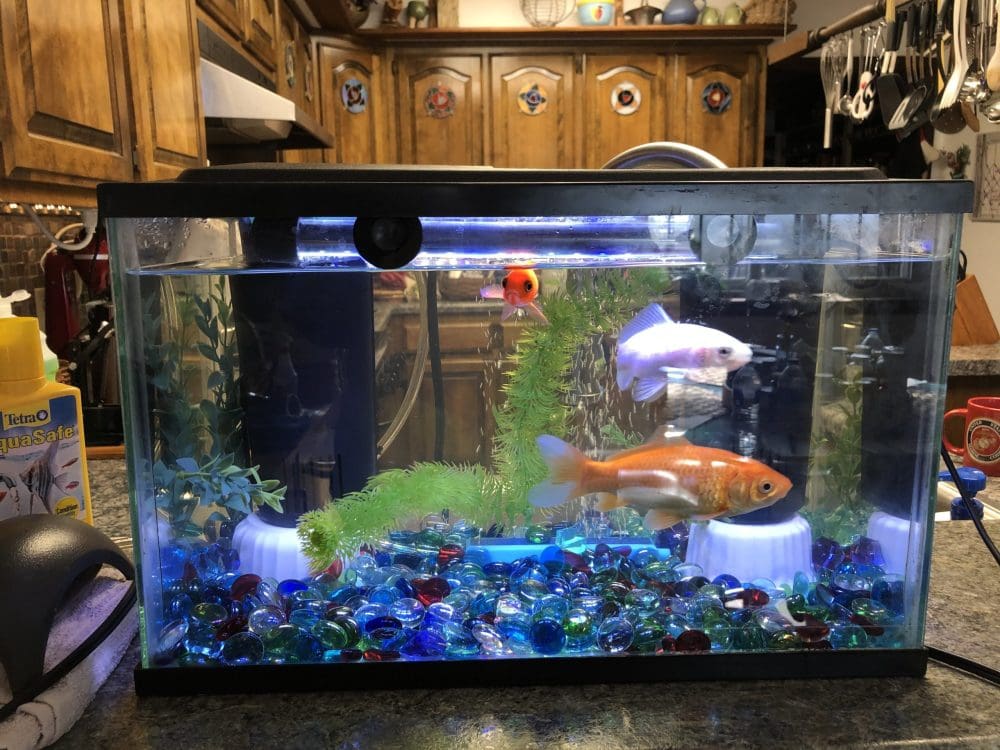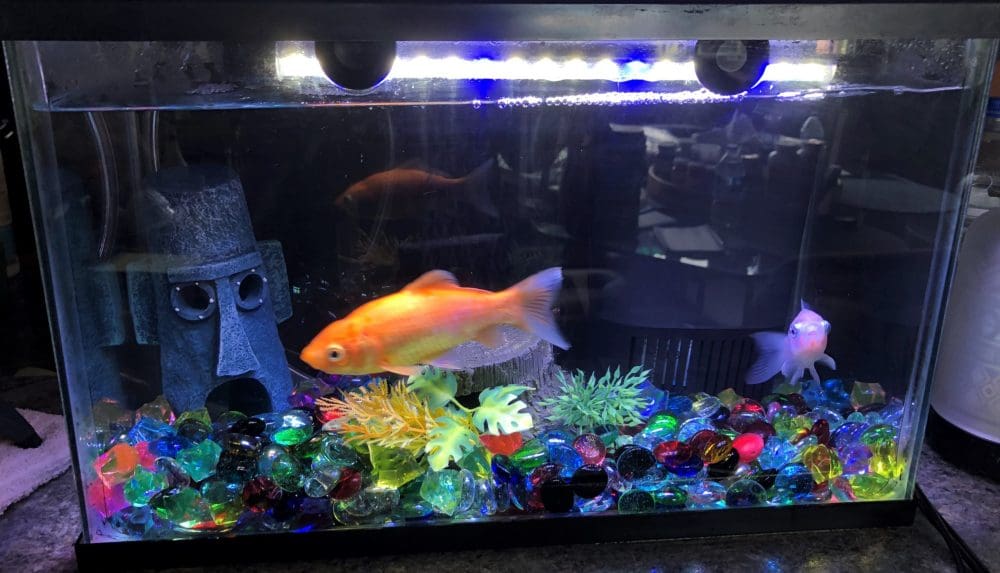 Running the TWO filters has lengthened the amount of time before I need to change the water again. The new, stick-shaped aerator we’re using now makes ME happier, and the change to the glass beads instead of gravel is much nicer.