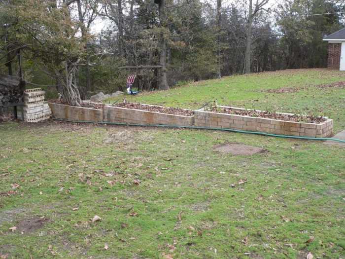 Happily, I learned of a local brick layer on Facebook recently. It took us a long time to finally get him out here, but he came yesterday and gave us an estimate on rebuilding the second planter for us – one that we could afford – AND he would come today at 8am!