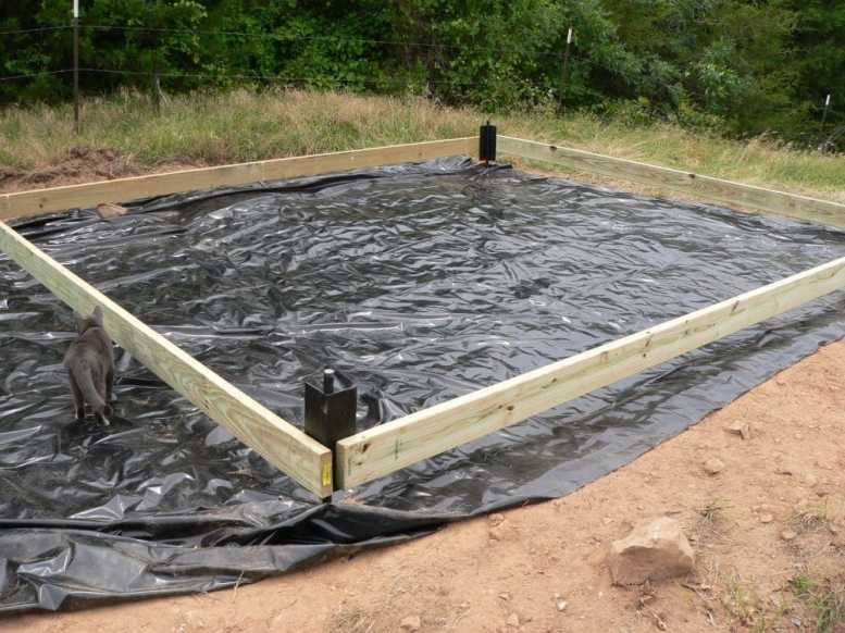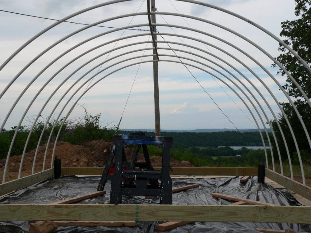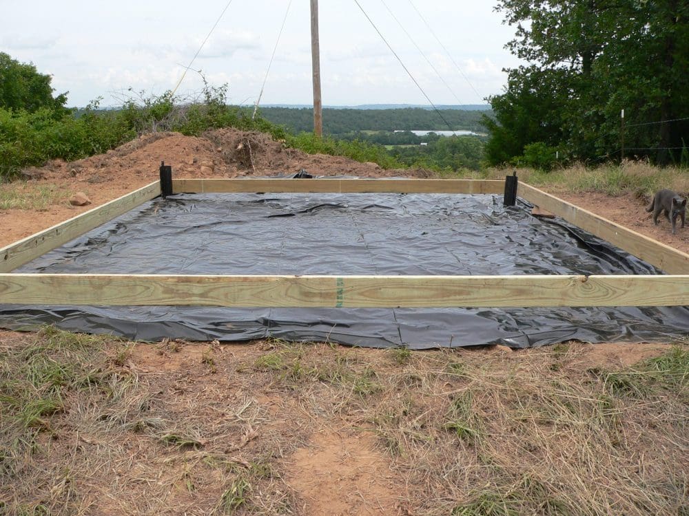 This is the foundation of the greenhouse. It will be 12 feet wide x 14 feet long. You’re looking at it from the west, looking east. We put down two sheets of black 4 mil plastic sheeting that we hope will keep the weeds from growing. This will be the floor of the greenhouse. When we get a bit farther, we’ll put rocks and bricks around the bottom to hold the sheeting in place better.