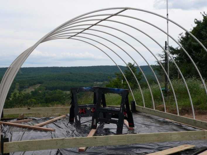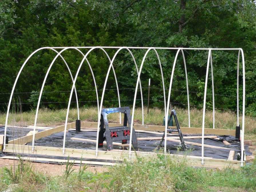 We made the ‘spine’ of the greenhouse that will go along the top of the oval we’ll make with the pvc pipe. We’ll attach 10 foot sections to the spine, bend them and attach them with straps along the outside perimeter of the greenhouse.