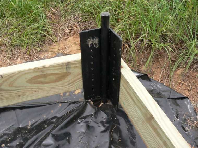 My husband made four of these stakes. The pipe is solid and 2 feet long. Then he welded on heavy angle iron, and then drilled a gazillion holes so that we could attach the foundation wood at whatever level needed for the structure to be as level as possible. Since the piece of land isn’t flat, and we run into solid rock at different depths for each stake, this is quite a process. We drilled as deeply as we could, then poured some water in the hole, and then used a sledge hammer to get the stakes in. Then we screwed the wood to the stakes after leveling it and making sure the corners were square.