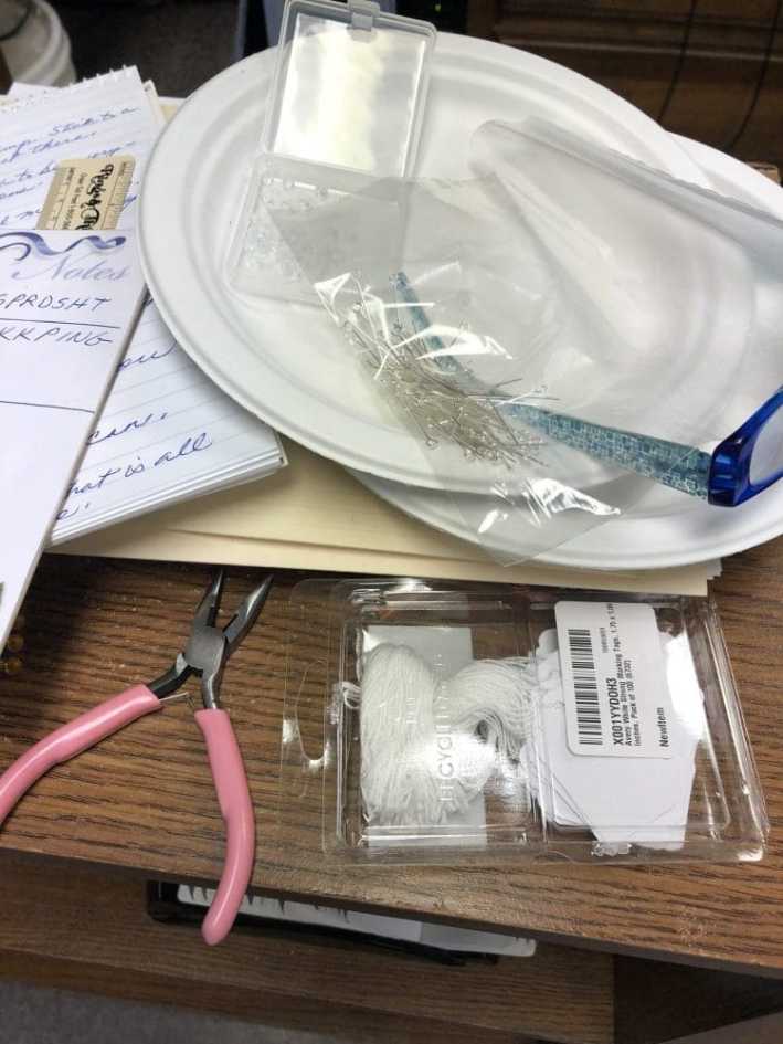 It started out where I had a few different kinds of findings, labels, earring cards and tools I kept these in a neat wooden ‘thingie’ I found at a garage sale. Soon my supplies overloaded its capacity and things hit the fan after that.