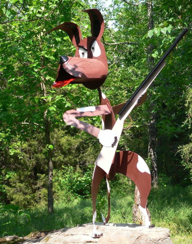 This one is a “Cleaning Robot.” He has a broom in one hand and a ‘dust pan’ in the other, ready to do a quick clean-up when needed. His bow tie used to be bright red. Since his has really faded and is also rotting, a new one is on the way. He is made from a combination of an old propane tank and scrap metal, plus an old set of fireplace tools.