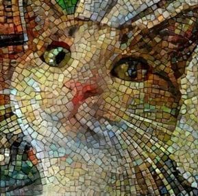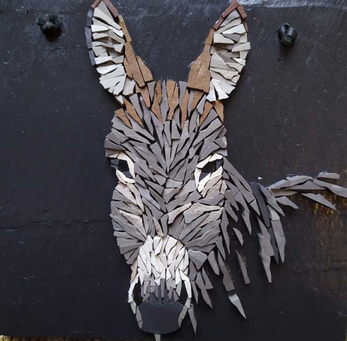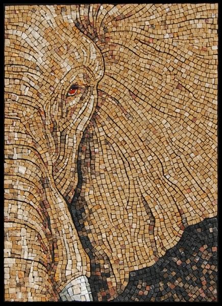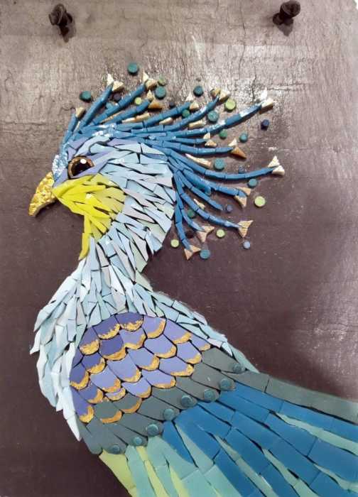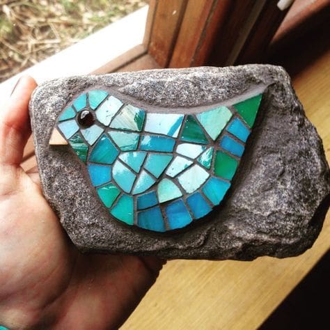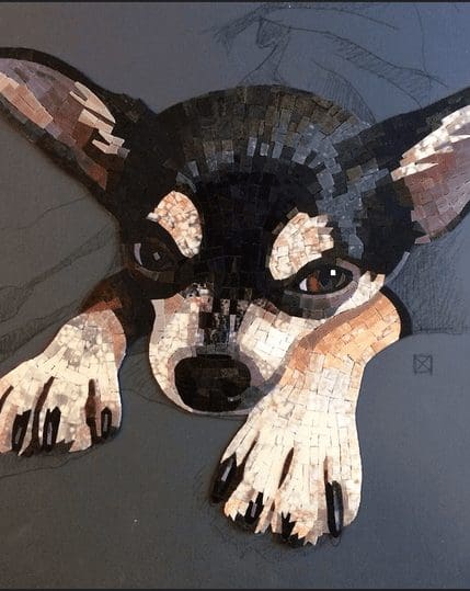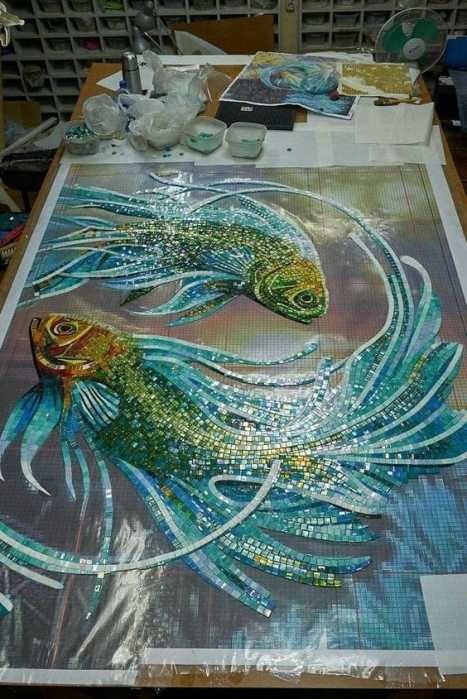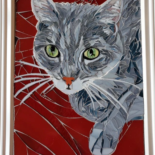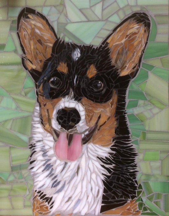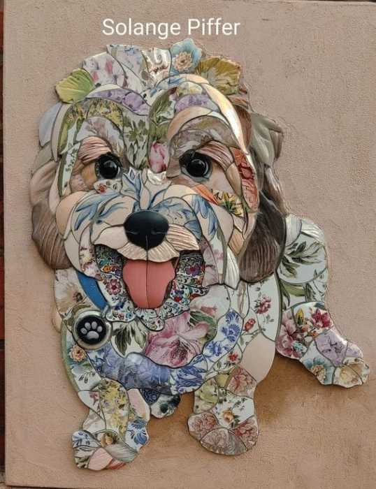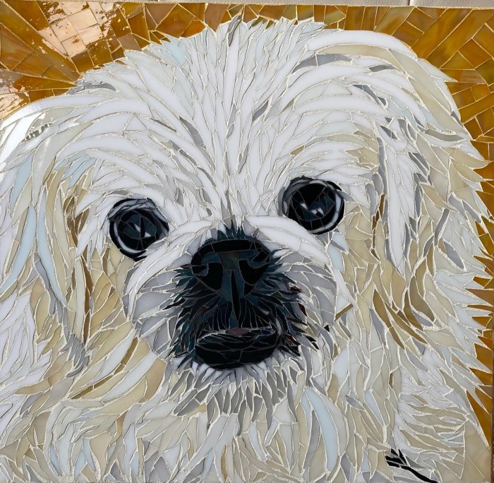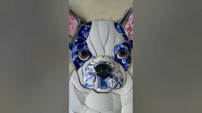 In the shop, I’ve started a new mosaic bowl. The design is free-form, meaning I’m just doing what I like. The sides of the bowl really slope, so I can only do a ‘ridge line’ each day, covering the glass only on the very top of the bowl, then turning it and adding more. Otherwise, the tiles slide down the bowl and dry wherever they end up. (Lesson on a previous sloping piece.)