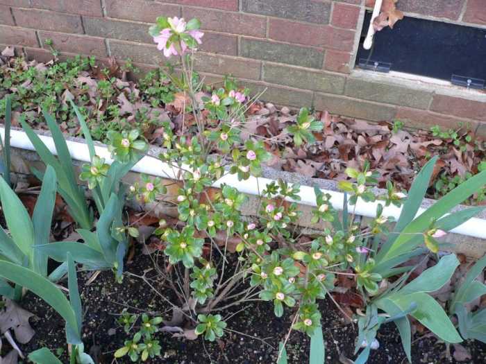 I felt encouraged to see this azalea plant with one bloom and the buds in the middle of this cold snap. It’s supposed to get to 56 this afternoon. Somehow that just isn’t very encouraging right now. I would really like to continue my weed whacking, even if it’s just a little bit each day, but this is just too cold now.