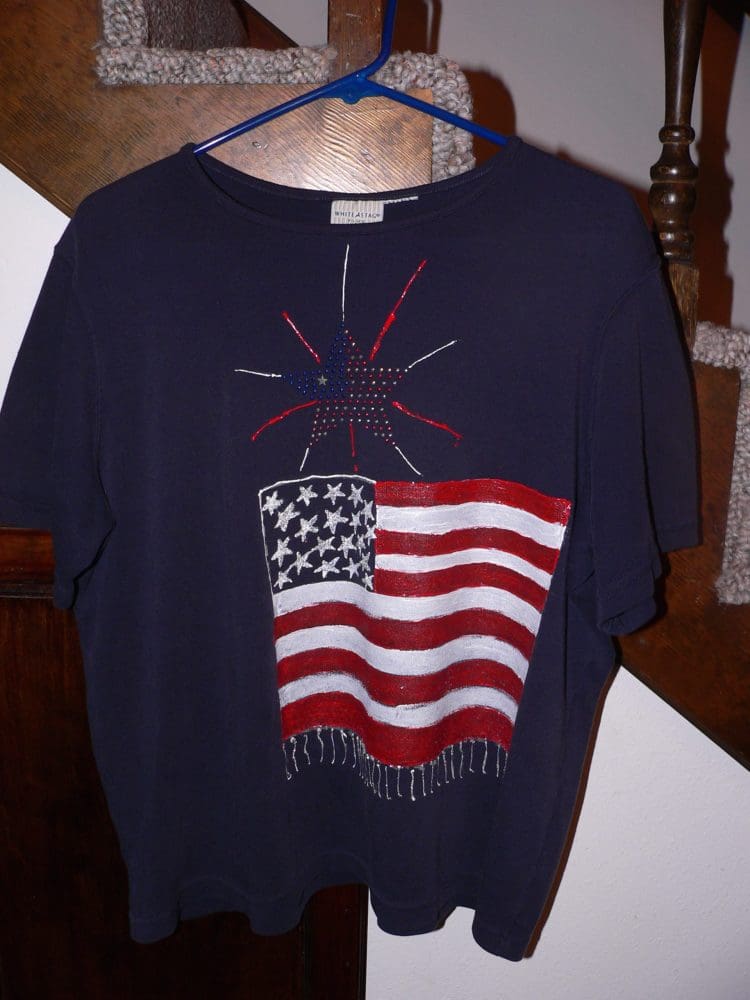 The star at the top came on the shirt. It’s little bitty star-shaped rivets in the patriotic pattern and colors. I just love it, and I’ve worn this shirt for years. I decided to paint the very handmade looking flag under the star. I went for an old, worn look and added glitter to the stats and the ‘fringe.’