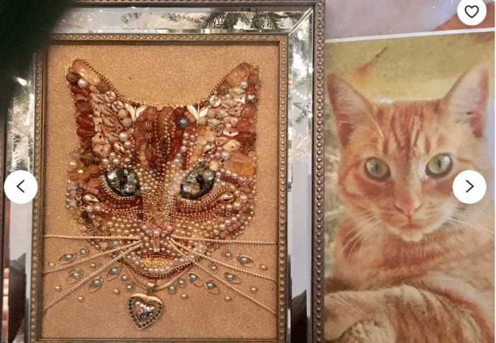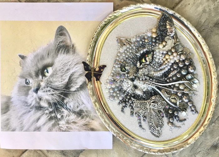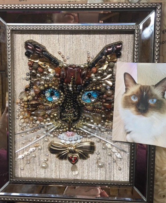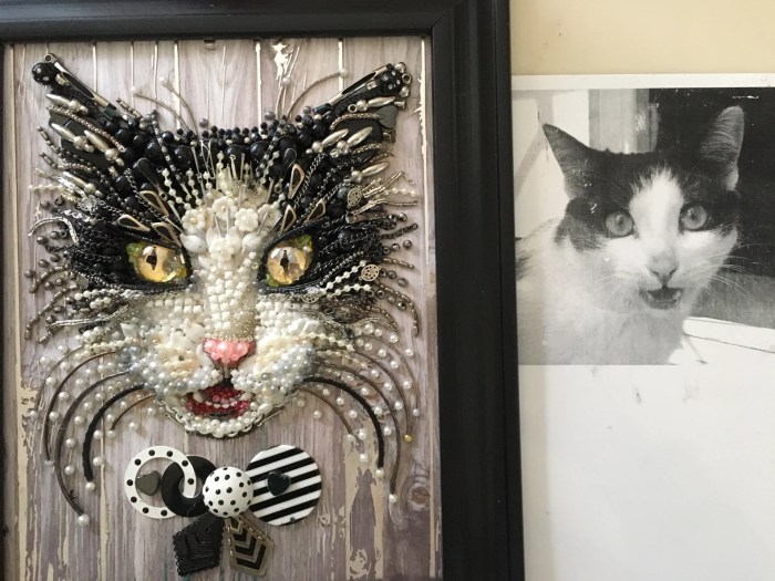 Emmie creates pet portraits via paper collage. She starts out with a picture you have sent her. She sketches the pet, then gathers bits of magazines. She creates the background first, then creates the pet’s body, finishing up with eyes and nose, capturing the personality of your pet. She includes words in the background of the portrait that mean something particularly to you, such a a pet’s nickname, other pet’s names, the pet’s favorite toy, etc. Also, somewhere in each portrait is a hidden butterfly.
